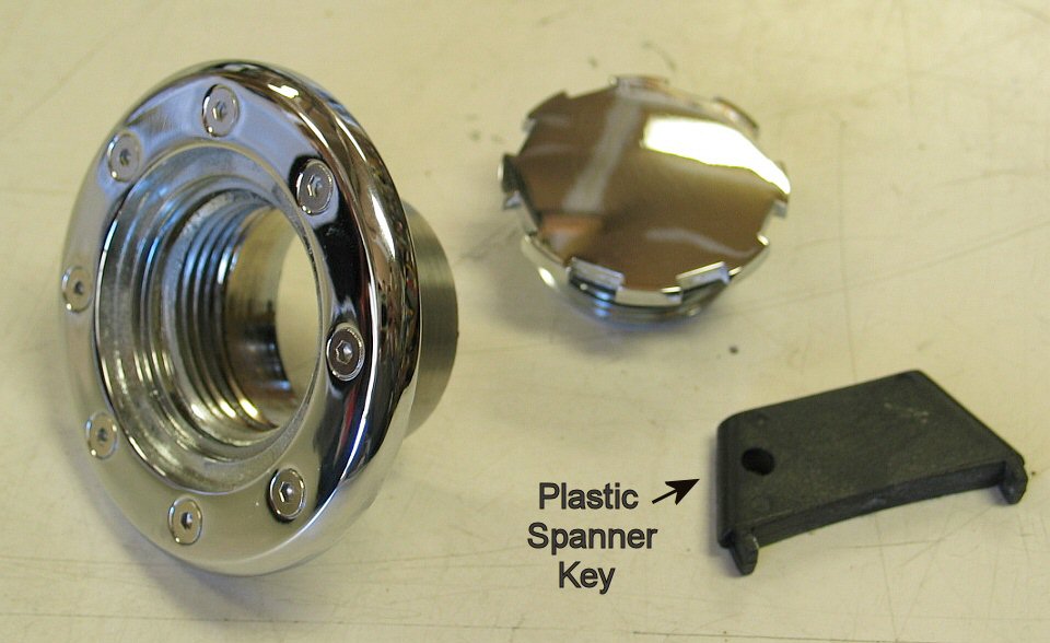 The removable cap is has a threaded insert using left handed threads that requires a key (included). The Plastic Spanner Key is about the only way to remove it to fill the tank with gas. |